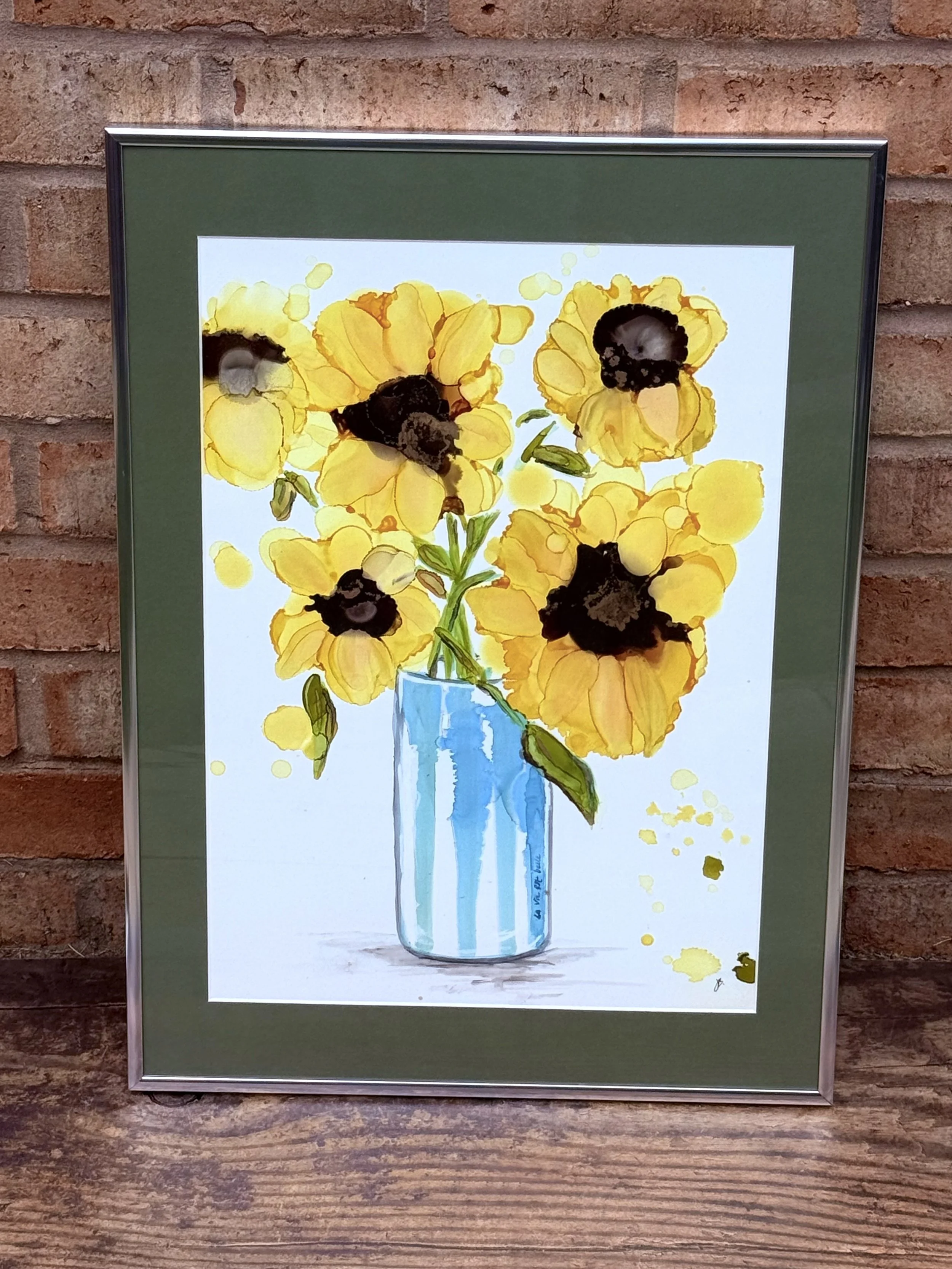 The sunflowers are displayed in a gorgeous light blue, stripey vase, scribed with the French “la vie est belle”, which translates as “ life is beautiful”.